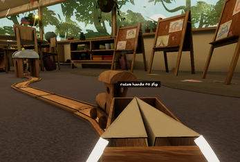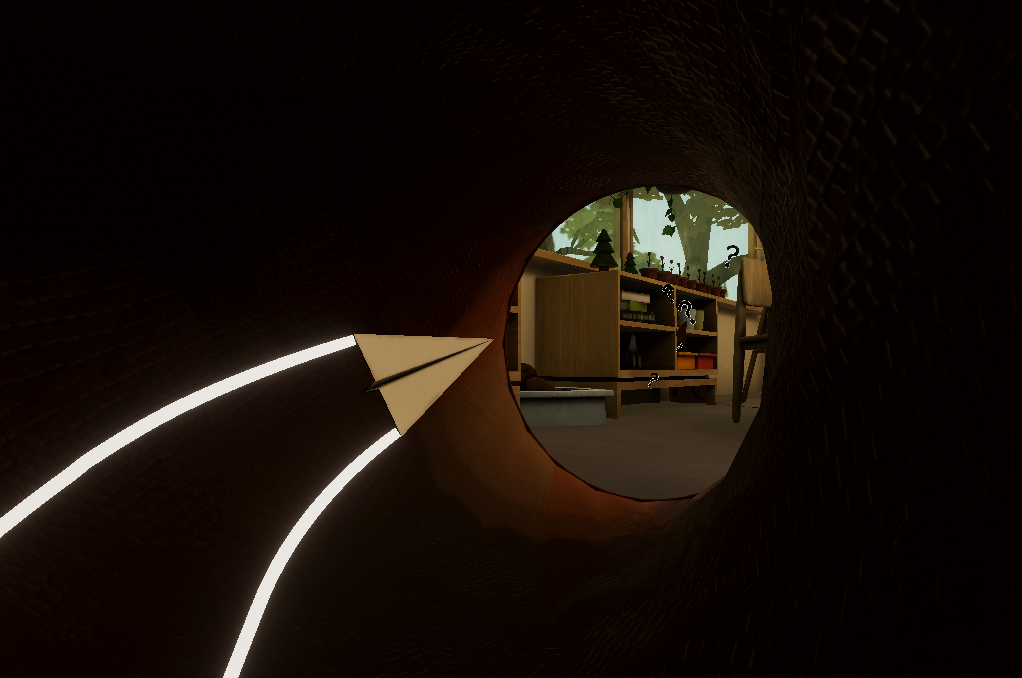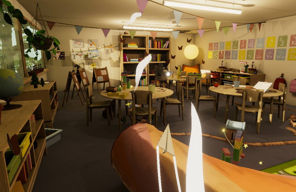 The scene is set in a children’s classroom/playroom where the ‘player’ is positioned as the paper plane flying. The desired atmosphere of the environment is based on our 3 ‘w’s’ - Whimsy, Weightlessness and Wonder. Players are able to explore the environment and discover various interactive elements.